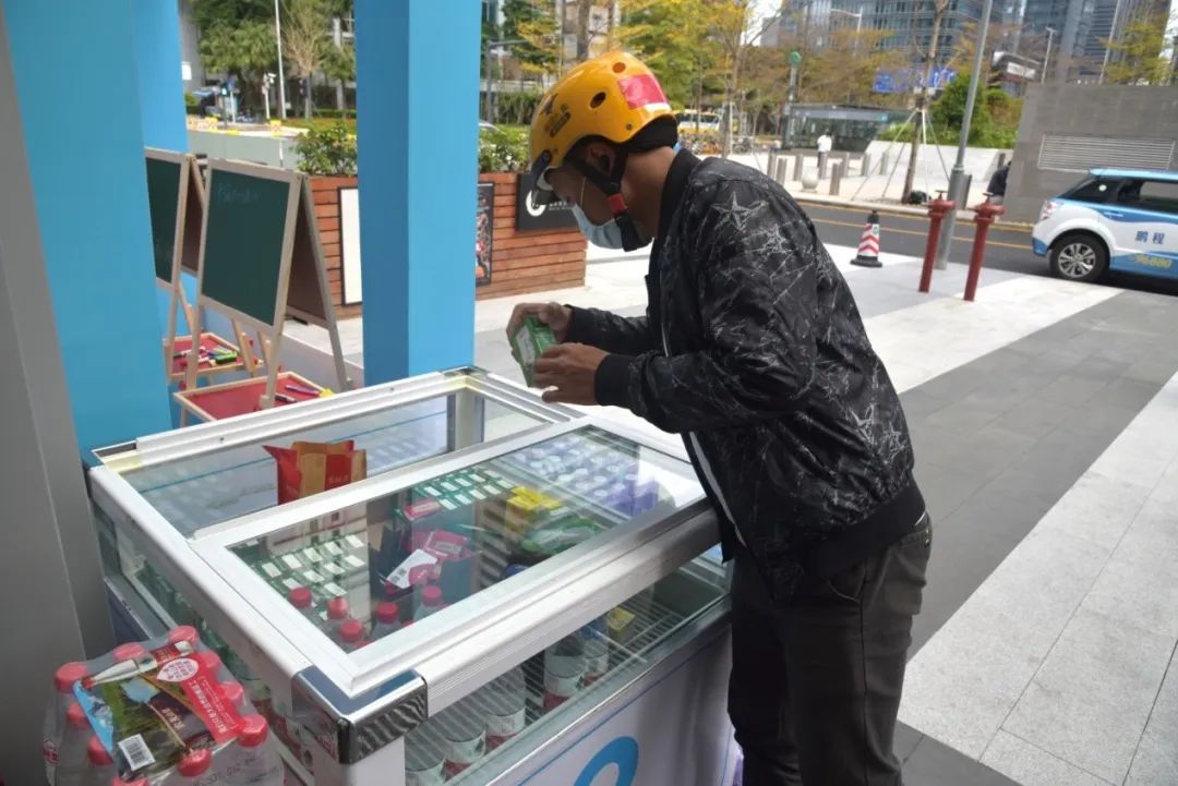 2月29日,一位外賣小哥從“無人冰柜”里領(lǐng)取飲料。新華社記者 趙瑞希 攝