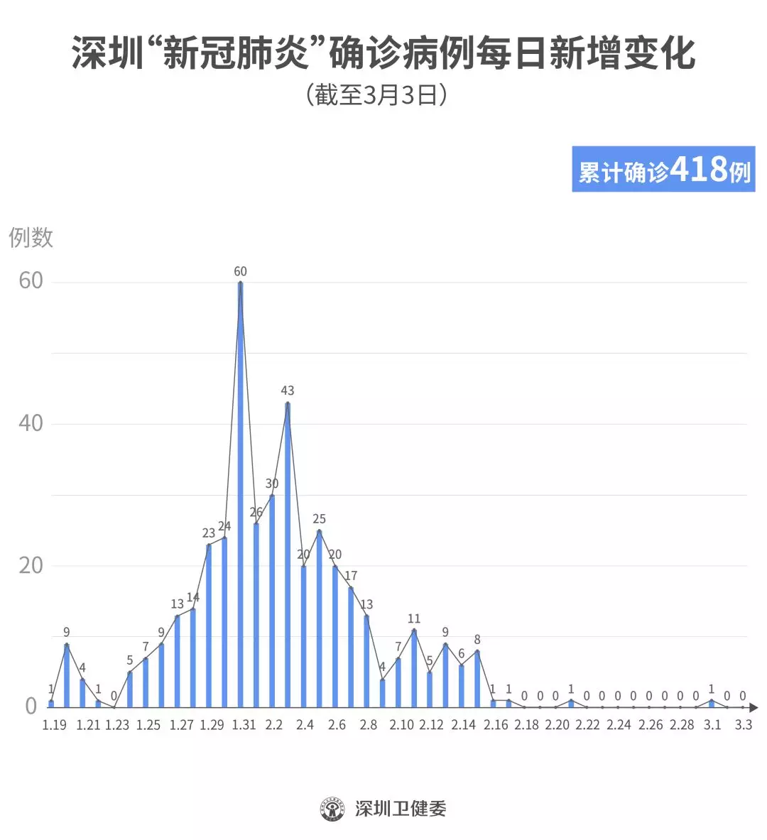 截至3月3日24時,深圳累計報告“新冠肺炎”確診病例418例。3月3日當(dāng)天全市無新增確診病例,當(dāng)天出院病例9例(從2月26日起不再公布出院個案)。