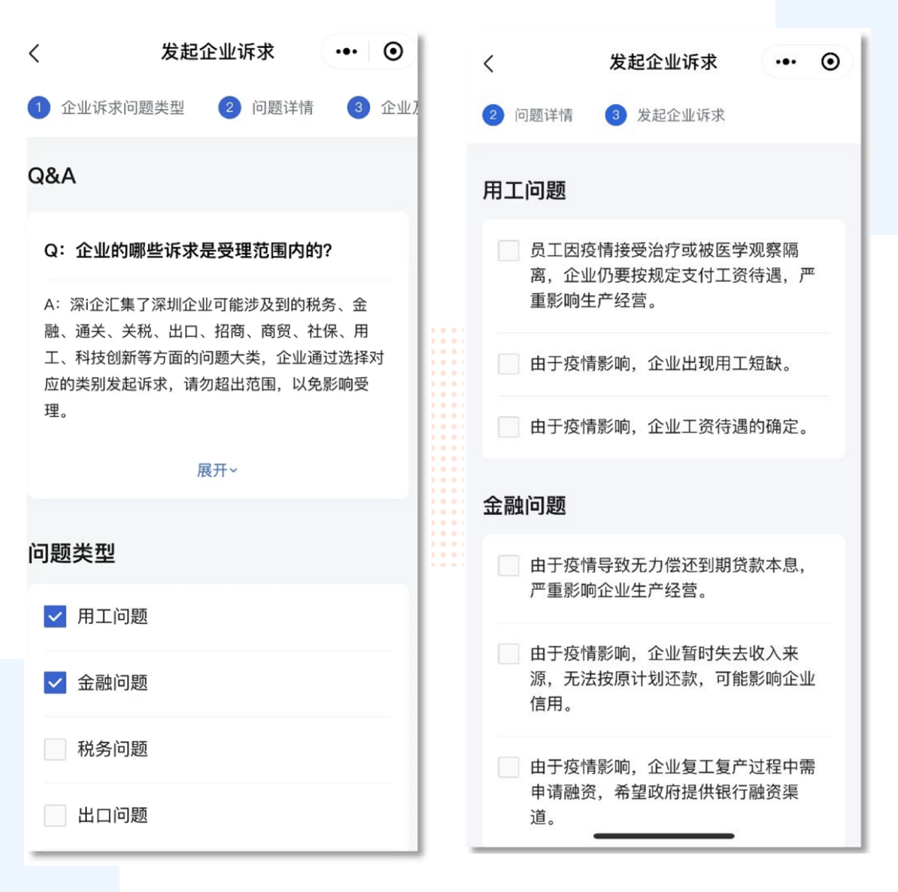 ③遇到多個(gè)類別的訴求需要反饋,可從平臺(tái)首頁“企業(yè)訴求”版塊中選擇“更多”,進(jìn)入全部問題列表,勾選相應(yīng)問題類別并完成信息填寫即可。