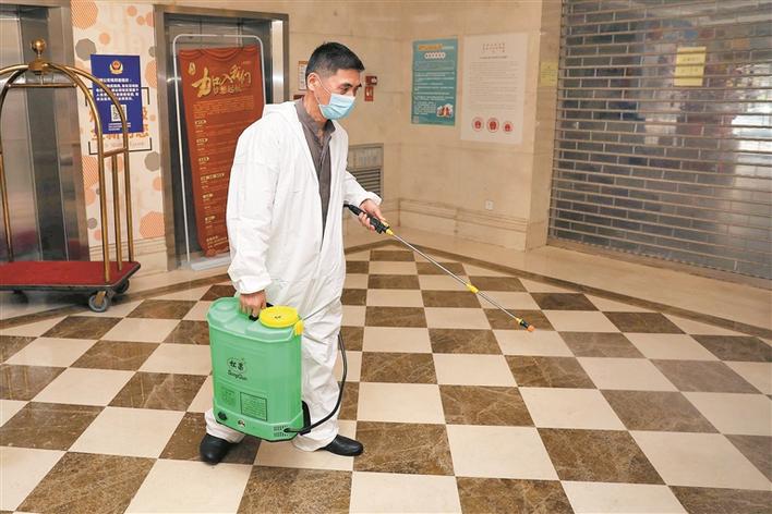 ▲工作人員對酒店大堂進(jìn)行消毒。深圳晚報記者楊少昆攝