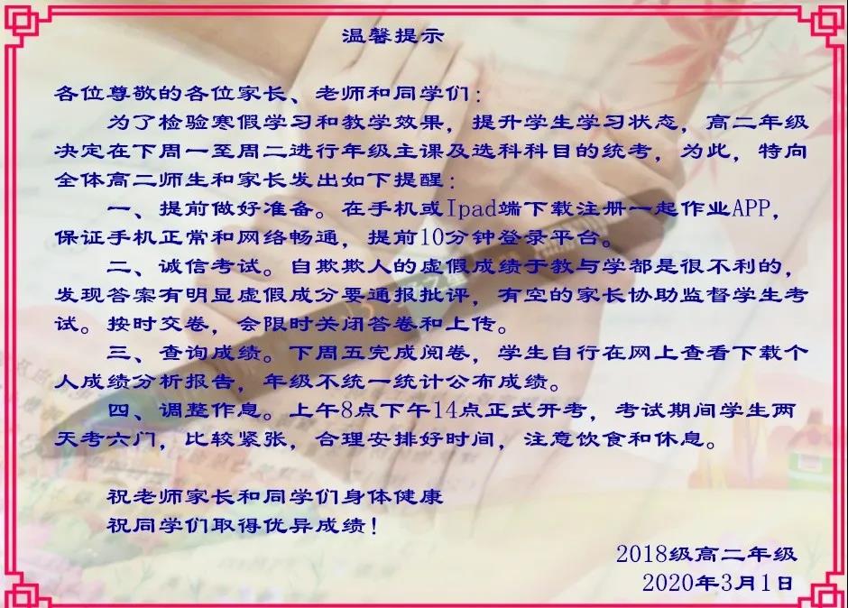 為了提高考試的可信度,考前各班級還進行了誠信教育,讓學(xué)生明白誠信考試的重要性以及自欺欺人的危害,并發(fā)動居家的家長積極配合監(jiān)考。考前,學(xué)校也向老師學(xué)生和家長發(fā)了提示,提醒網(wǎng)上考試注意事項。