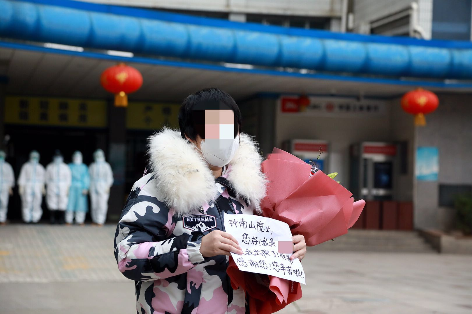 張冬雪走近后,面對(duì)記者的鏡頭,打開(kāi)自己事先準(zhǔn)備好的一張紙,上面寫(xiě)著“鐘南山院士,您好,今天我出院了,非常感謝您,您辛苦啦!”