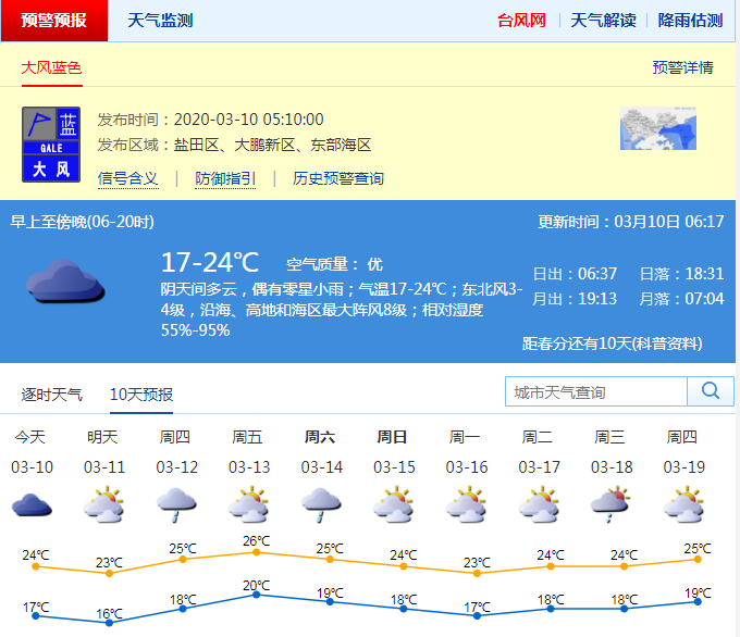 盡管冬天已經(jīng)過去,但是當(dāng)下的深圳乍暖還寒,氣溫變化較大,需要依據(jù)氣溫變化增減衣物,以防感冒。受新一股冷空氣影響,10日早晨有陣雨,伴零散雷暴,北風(fēng)加大,沿海、海區(qū)和高地有7級左右陣風(fēng)。10日白天降雨結(jié)束,可見陽光,氣溫略降3-4℃,氣溫18-23℃。11日氣溫下降至16℃左右,天氣轉(zhuǎn)涼。12-13日氣溫明顯回升。 (記者董思)