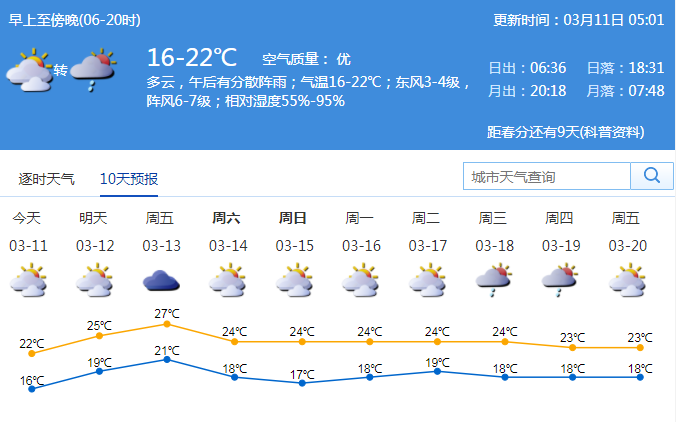 見圳客戶端·深圳新聞網(wǎng)2020年3月11日訊 據(jù)市氣象臺消息,今日深圳多云,午后有分散陣雨;氣溫16-22℃;東風(fēng)3-4級,陣風(fēng)6-7級;相對濕度55%-95%。