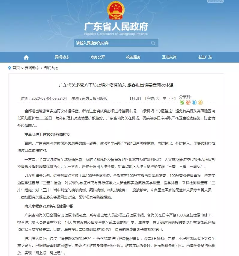廣東省內(nèi)海關(guān)已全面啟動(dòng)健康申報(bào)制度,所有進(jìn)出境人員必須進(jìn)行健康申報(bào)。