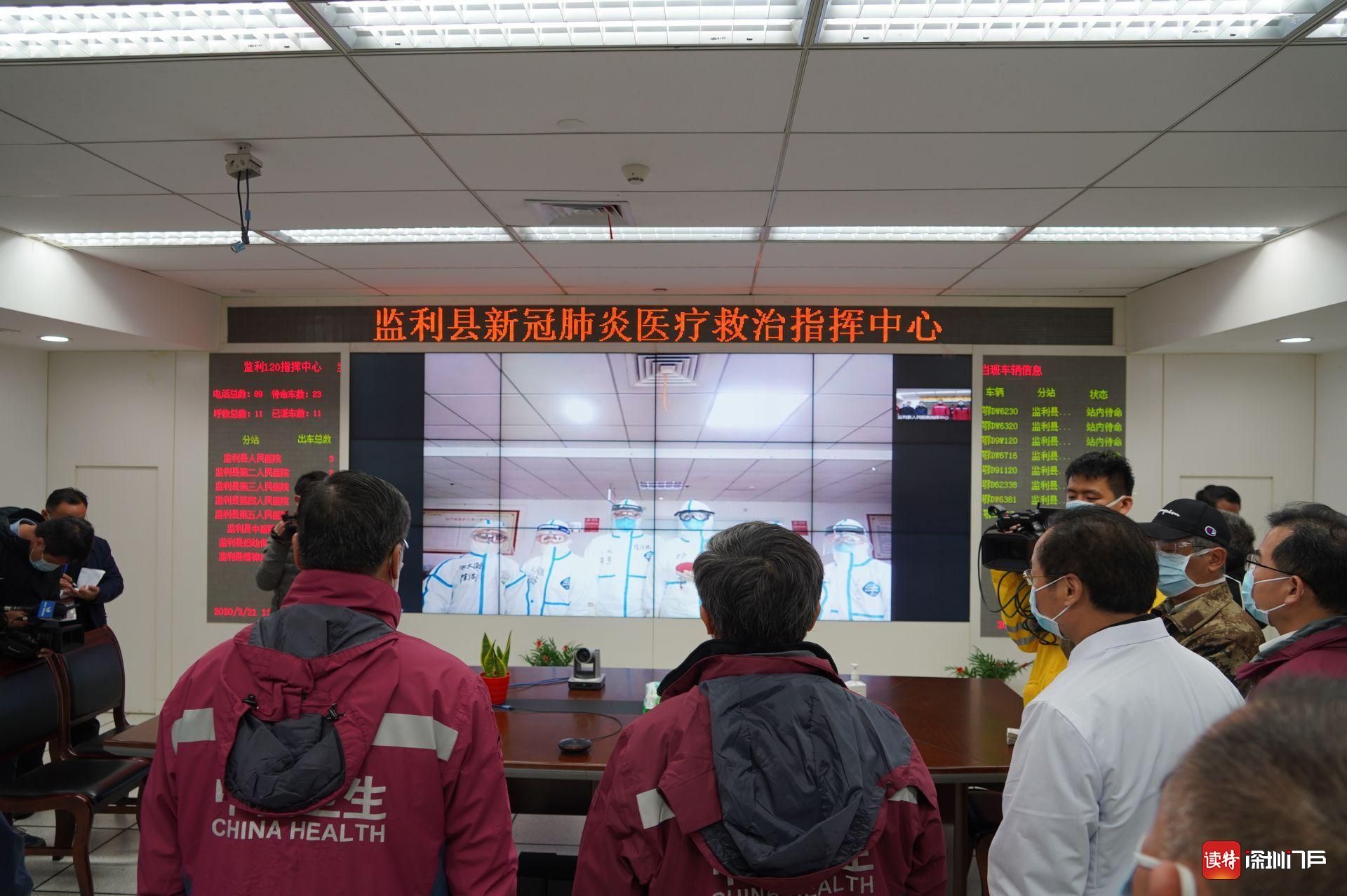 2月21日,監(jiān)利縣人民醫(yī)院指揮中心,廣東省醫(yī)療隊前指領(lǐng)導(dǎo)與縣中醫(yī)院ICU里的廣東醫(yī)療隊隊員進(jìn)行視頻連線。