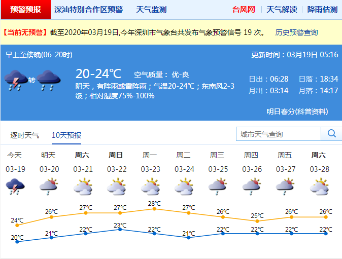 當前,深圳已進入強對流天氣多發(fā)季節(jié)。未來幾日天氣是否平穩(wěn)?據(jù)市氣象臺預測,19日深圳有雷陣雨,局部大雨,氣溫20℃至24℃;20日陣雨轉(zhuǎn)多云;21日至24日濕度加大,氣溫逐日回升,天氣轉(zhuǎn)熱,早晚有輕霧或霧。