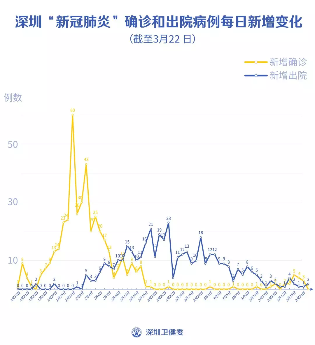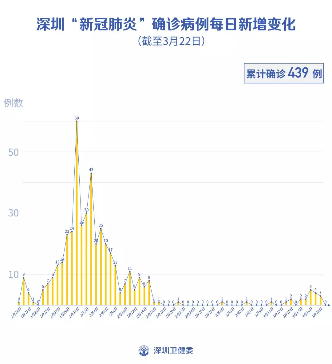 截至3月22日24時,深圳累計報告“新冠肺炎”病例439例。3月22日當天無新增,出院2例。