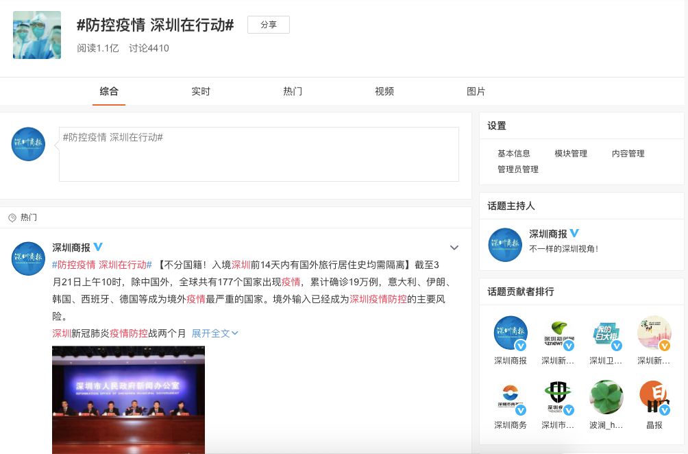 疫情發(fā)生初期,深圳商報微博創(chuàng)建話題 #防控疫情 深圳在行動# ,以高度的責任感和使命感全方位加強宣傳報道和輿論引導,疫情相關信息均帶話題發(fā)布,人們可以系統(tǒng)地查看疫情相關信息。