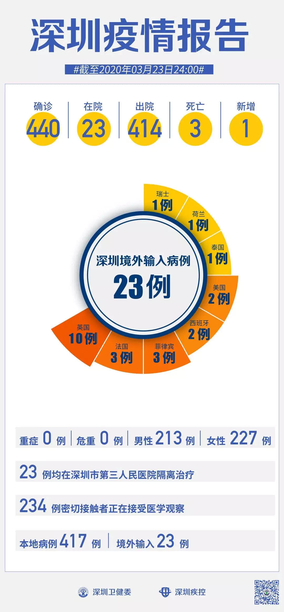 截至3月23日24時,深圳累計報告“新冠肺炎”病例440例。3月23日當天新增1例,出院1例。
