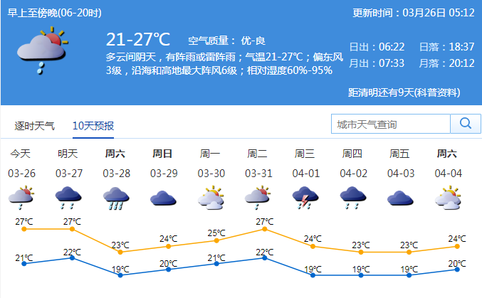 見圳客戶端·深圳新聞網(wǎng)2020年3月26日訊 今日深圳多云間陰天,有陣雨或雷陣雨;氣溫21-27℃。受偏南暖濕氣流影響,最近深圳天氣溫暖,氣溫回升明顯,最低氣溫在20℃以上,連續(xù)4天最高氣溫突破28℃。