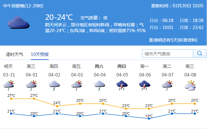 市氣象臺(tái)預(yù)測(cè),31日至4月1日有陣雨或雷陣雨;2-3日多云到陰天,部分時(shí)間有分散小雨;展望清明假期期間,有明顯降雨過程。注意雨霧天氣低能見度對(duì)交通安全的影響。