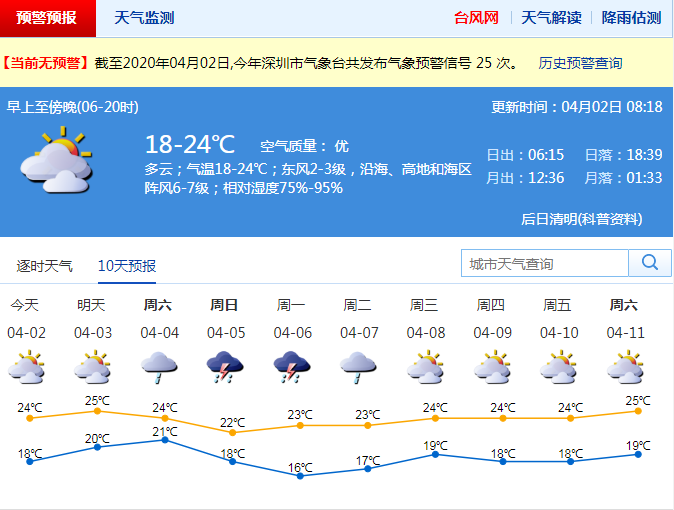 見圳客戶端·深圳新聞網(wǎng)2020年4月2日訊 深圳市氣象局預(yù)計2日陰天間多云,有分散陣雨,沿海和高地偏東陣風(fēng)6-7級,氣溫18-22℃;3日多云間陰天,有輕霧和分散陣雨,氣溫略升;展望清明假期(4-6日)有一次明顯降雨過程,間中伴有雷暴。7日降雨結(jié)束。