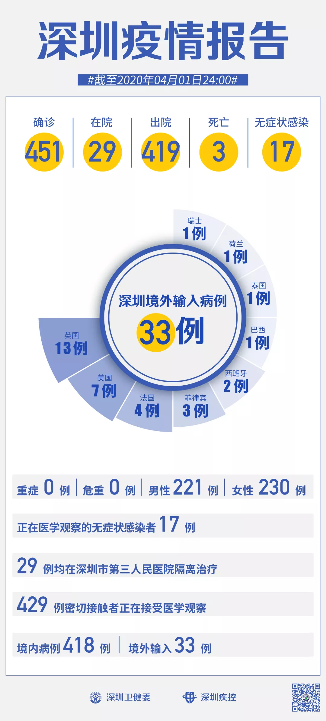 截至4月1日24時(shí),深圳累計(jì)報(bào)告新冠肺炎病例451例。4月1日當(dāng)天新增無(wú)癥狀感染者2例,出院2例。