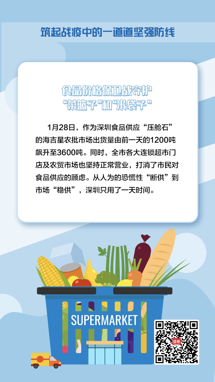 “食品價(jià)格保衛(wèi)戰(zhàn)”第一槍在1月27日打響。當(dāng)天,市菜籃子工程領(lǐng)導(dǎo)小組召集各大商超市場責(zé)任人開會,制定詳細(xì)的作戰(zhàn)計(jì)劃。1月28日,作為深圳食品供應(yīng)“壓艙石”的海吉星農(nóng)批市場出貨量由前一天的1200噸飆升至3600噸。同時(shí),全市各大連鎖超市門店及農(nóng)貿(mào)市場也堅(jiān)持正常營業(yè),打消了市民對食品供應(yīng)的顧慮。從人為的恐慌性“斷供”到市場“穩(wěn)供”,深圳只用了一天時(shí)間。
