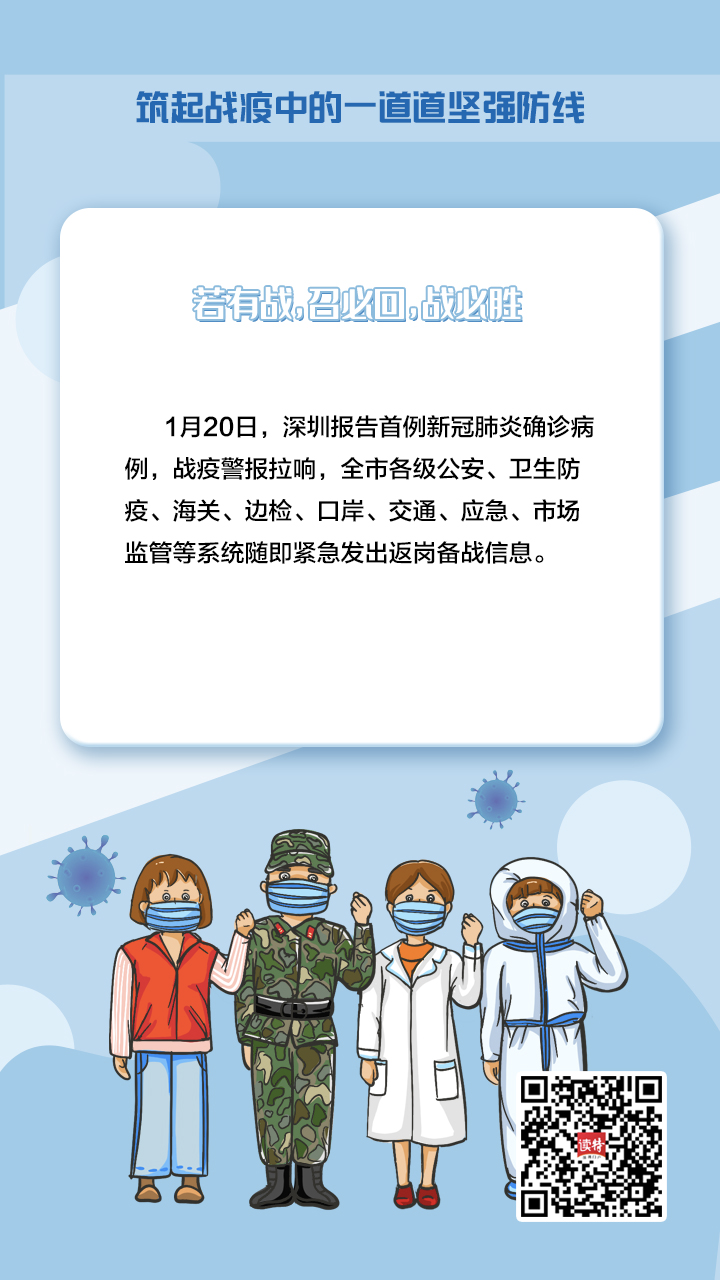 牢記習(xí)近平總書記的重要指示,深圳在新冠肺炎疫情防控的人民戰(zhàn)爭、總體戰(zhàn)阻擊戰(zhàn)中,鑄造了一支由不同“兵種”、精銳之師組成的守護(hù)者隊(duì)伍,堅(jiān)定地筑起一道堅(jiān)強(qiáng)屏障,守護(hù)好城市“外防輸入、內(nèi)防擴(kuò)散”的門戶。