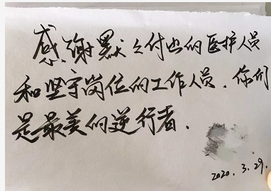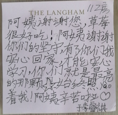 每當(dāng)看到了一批批解除隔離的人開開心心地收拾行李回家,看到客人留下的感謝信、微信留言,尤其是聽到客人們離開時一句句真摯的話語,同事們都倍感欣慰,更加堅(jiān)信風(fēng)雨過后,終會見到彩虹。
