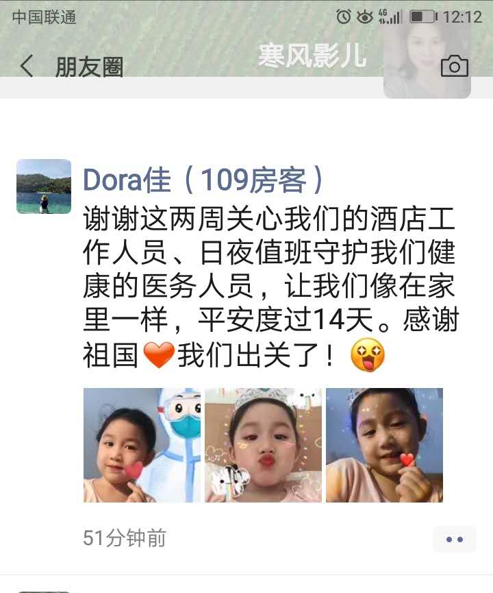 四是對確有特殊要求的隔離人員進(jìn)行個性化服務(wù)。住213的某先生從文萊回國因家里原因在隔離期間情緒波動比較大,要求給他買10盒煙及啤酒,楊梅林了解到這一情況后,第一時間添加了客人的微信,只要一有空閑就找客人聊天并開導(dǎo)他不要有心理壓力,幾天下來,客人明顯開朗了很多,煙已經(jīng)很少抽了,啤酒一餐只喝一瓶,考慮到安全問題,每餐均被給楊梅林部分“退貨”了。還有401房單獨(dú)住了一位11歲的小女孩,劉群每天有空就給小朋友打電話,噓寒問暖,對入住酒店的特殊客人或帶小朋友的房間楊梅林和劉群服務(wù)的特別細(xì)致。她們常掛嘴邊的一句話是:隔離人不隔離愛,讓他們感受到家一樣的溫暖。