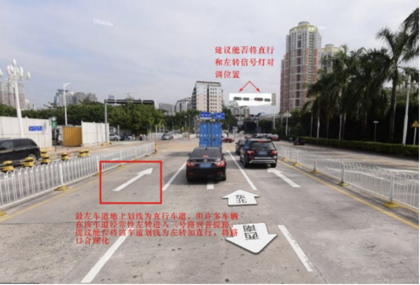 市民建議,桂花路與三號(hào)路交叉路口的直行信號(hào)燈和左轉(zhuǎn)信號(hào)燈對(duì)調(diào)位置;同時(shí),桂花路此處的直行最左側(cè)車道可改為左轉(zhuǎn)加直行標(biāo)識(shí)。這樣既可以方便社會(huì)車輛在此左轉(zhuǎn),又避免有些駕駛員因?yàn)闆](méi)注意到左轉(zhuǎn)信號(hào)燈而隨直行車輛左轉(zhuǎn)造成的堵塞或交通事故。