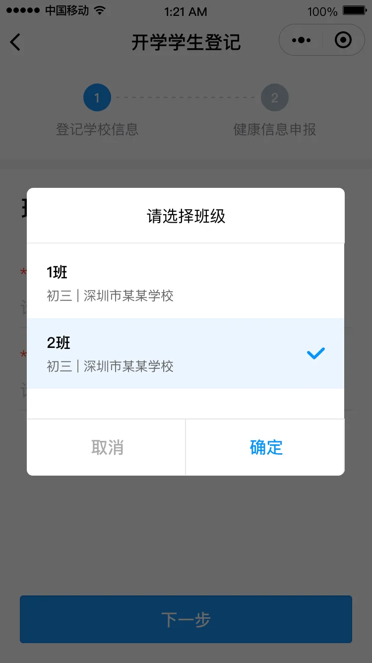 進(jìn)入“開(kāi)學(xué)學(xué)生登記”頁(yè)面,點(diǎn)擊“馬上登記”進(jìn)入登記界面,填寫(xiě)班主任姓名和手機(jī)號(hào)碼后點(diǎn)擊“下一步”,請(qǐng)選擇對(duì)應(yīng)的班級(jí),進(jìn)入健康申報(bào)卡界面。