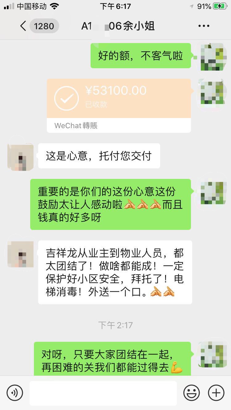 一天下來,吉祥龍小區(qū)共有156位愛心業(yè)主通過線上籌集款項53100元,最后以微信轉賬的形式轉給了吉祥龍小區(qū)服務中心負責人張經理,并委托其轉交給堅守在工作崗位的每一位物業(yè)員工手中。