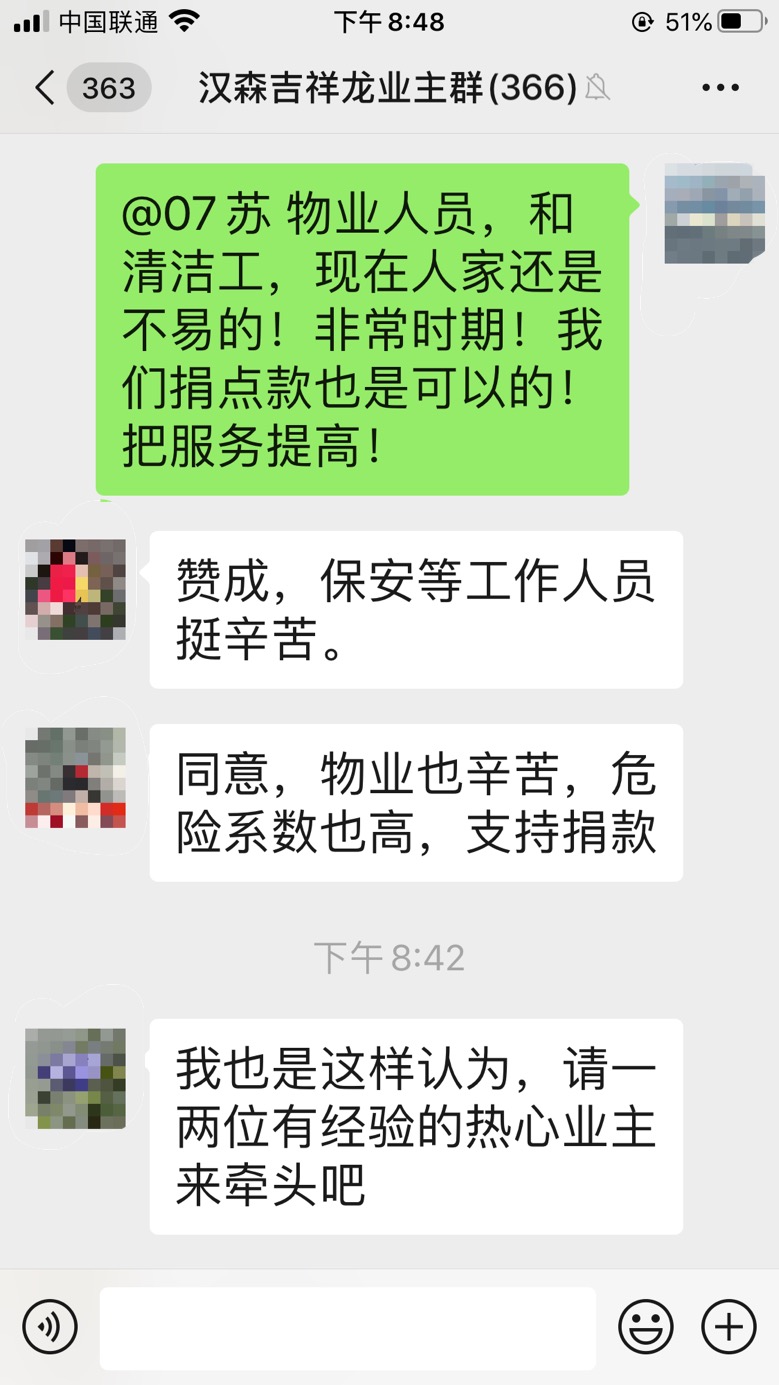 原來,吉祥龍小區(qū)業(yè)主因為覺得物業(yè)一線工作人員抗戰(zhàn)疫情工作危險又更辛苦,便在微信群內發(fā)起了給本小區(qū)物業(yè)人員捐款的倡議,收到了眾多業(yè)主的熱烈反響?!百澇?,保安等工作人員挺辛苦”、“同意,物業(yè)也辛苦,危險系數也高,支持捐款”……業(yè)主們通過討論,約定好捐贈方式全憑自愿、不搞強制、不論數額、謹表心意。短短一小時,捐贈金額就達到了3萬余元。業(yè)主余小姐表示,吉祥龍小區(qū)業(yè)主和物業(yè)人員在防疫過程中正團結一心、關系緊密,一定能保護好小區(qū)安全。