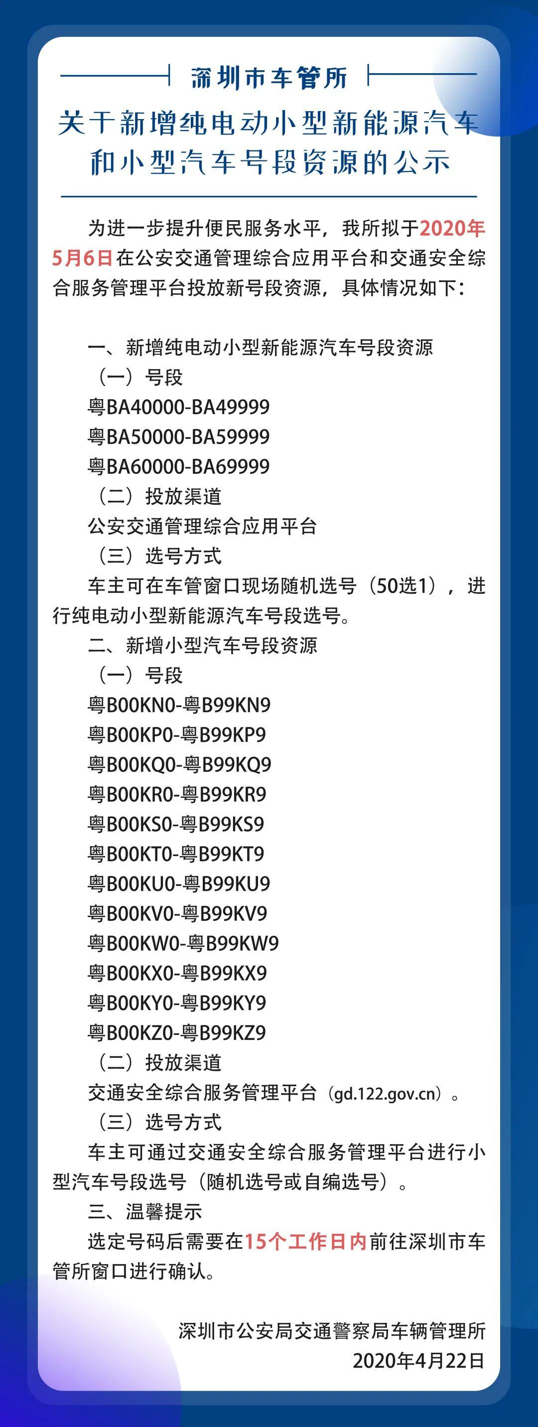 見圳客戶端?深圳新聞網(wǎng)2020年4月23日訊 為進(jìn)一步提升便民服務(wù)水平,深圳市車管所擬于2020年5月6日在公安交通管理綜合應(yīng)用平臺和交通安全綜合服務(wù)管理平臺投放新號段資源。具體情況如下:
