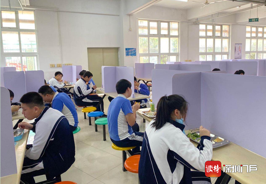 深圳特區(qū)報2020年4月27日訊 4月27日,深圳高三、初三學(xué)子返校。食堂是校園防控工作的重點,中午時分,學(xué)生就餐開始,實行錯峰就餐、分區(qū)就餐。有的學(xué)校將每張餐桌用有機玻璃隔板分隔用餐區(qū)域,有的學(xué)校在空間足夠的條件下實行單人單桌,按號就座。