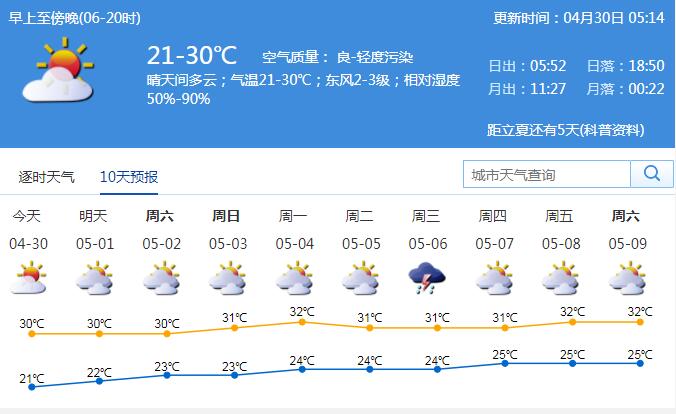 見圳客戶端·深圳新聞網2020年4月30日訊 我市今天晴天間多云,氣溫21-30℃;東風2-3級,相對濕度50%-90%。五一假期期間(5月1-5日)天氣總體平穩(wěn),以多云為主,早晚有輕霧,其中5日前后偶有短時陣雨;假期期間最高氣溫可達31-32℃,中午前后天氣炎熱。森林火險氣象等級較高,要注意用火安全;注意防暑防嗮。