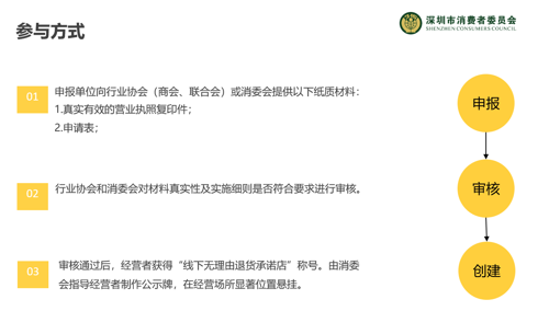 申請通過后,經(jīng)營者即可獲得“線下無理由退貨承諾店”稱號,具體參與方式見下圖。