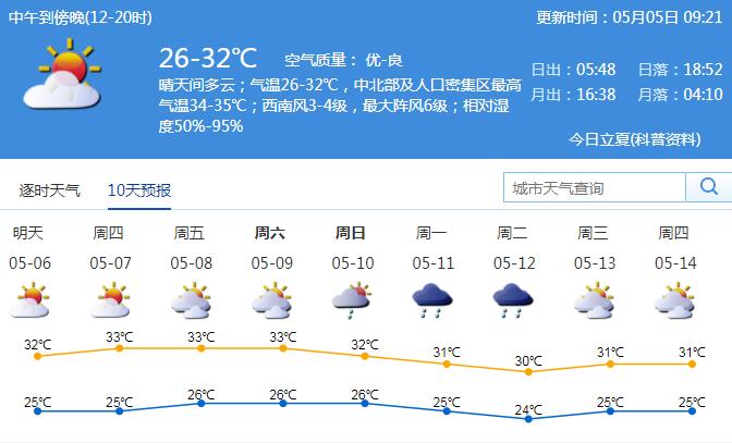 見圳客戶端·深圳新聞網(wǎng)2020年5月5日訊 深圳市氣象臺預(yù)計,5日我市晴天間多云,氣溫25℃-32℃,中北部和人口密集區(qū)最高氣溫34℃-35℃;6-9日多云間晴天,天氣炎熱,午后局地有熱雷雨;10-11日受冷空氣影響,有雷陣雨。