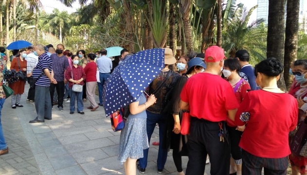 由于天氣熱,有些人在出門游玩時便摘了口罩。