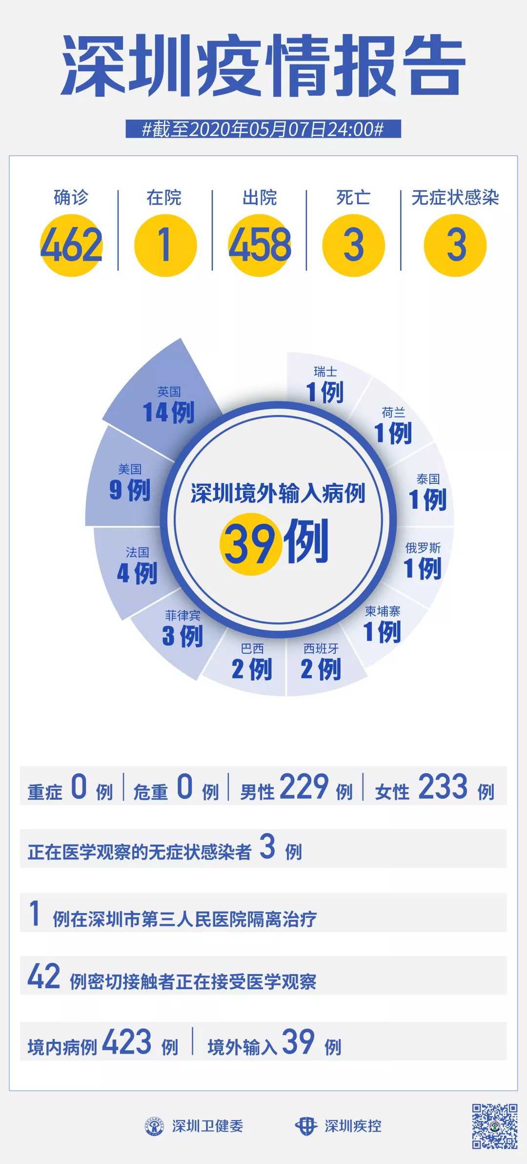 截至5月7日24時,深圳累計報告新冠肺炎病例462例。在院治療僅有1例。