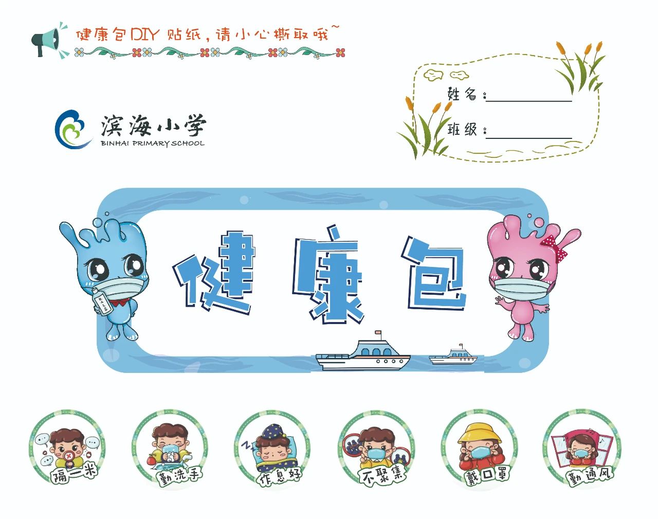 《健康包》,也是學(xué)校精心為返校的學(xué)生準(zhǔn)備的一份健康防疫小禮包,里面有臂貼、DIY貼紙等!這些萌萌的DIY貼紙,可以根據(jù)孩子們的個性需求和遵守情況,自由拼貼!學(xué)校通過這些充滿童趣的設(shè)計,讓孩子們將防護(hù)措施牢記于心!