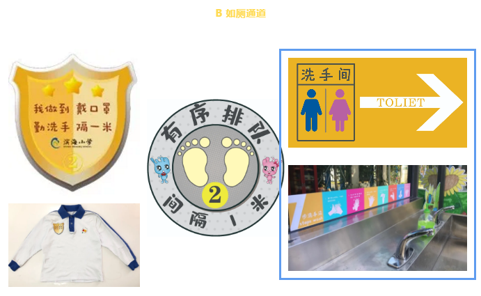 學(xué)校將教學(xué)區(qū)劃分為“綠黃藍(lán)”三區(qū),并精心設(shè)計了帶有濱海元素的“三色”入校通道、三色盾牌、三色貼紙等!