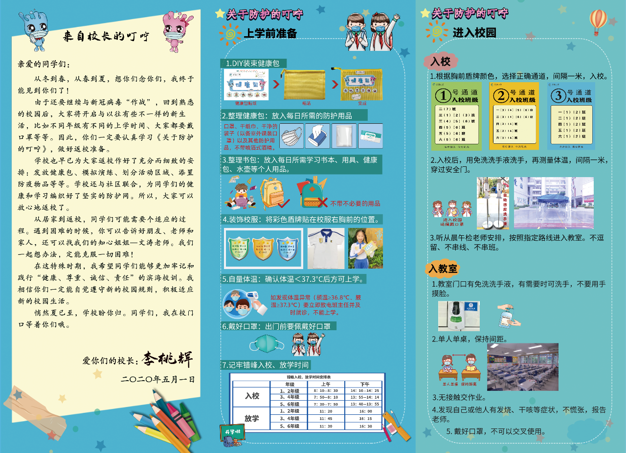 針對即將返校的學(xué)生,還有一份特別的《叮嚀》,來自李桃輝校長《愛的叮嚀》,這里有桃輝校長的暖心留言,還有幫助孩子們適應(yīng)全然不同的校園新生活的各種說明!