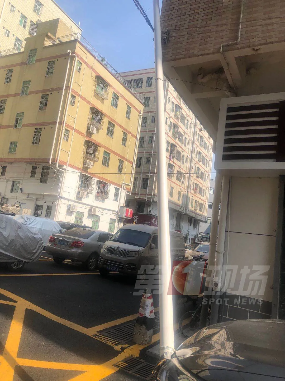 一截大約十米長的雨水管道從天而降,正好插中了周先生的愛車,就這樣立在了車頭。附近居民告訴記者,當時有個路過的小孩,差點被砸中了。