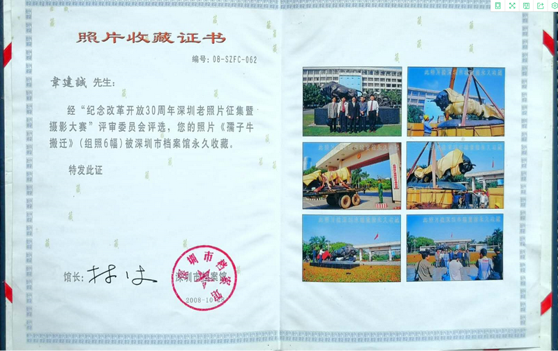 韋建誠(chéng)拍攝的《孺子牛搬遷》組照被深圳市檔案館永久收藏。(攝影:韋建誠(chéng))
