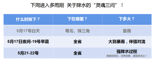 17日夜間到19日早晨,珠三角、粵東和陽(yáng)江、茂名有大雨到暴雨,其余市縣有大雨局部暴雨;雷雨時(shí)伴有8級(jí)左右的短時(shí)大風(fēng)。