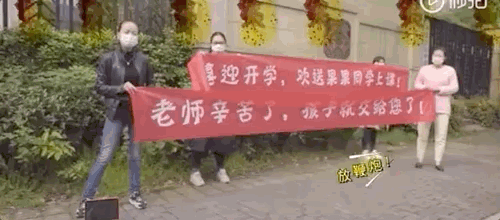 喜上眉梢的家長(zhǎng)們甚至站在校門(mén)口拉起橫幅:喜迎開(kāi)學(xué),歡送上課!