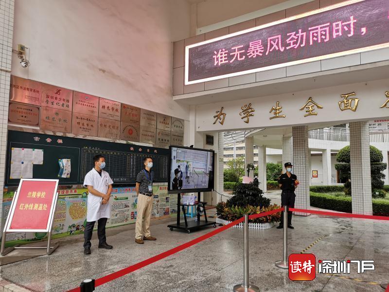 南山區(qū)科創(chuàng)學(xué)校,安保人員正在為返校的學(xué)生測(cè)量體溫。