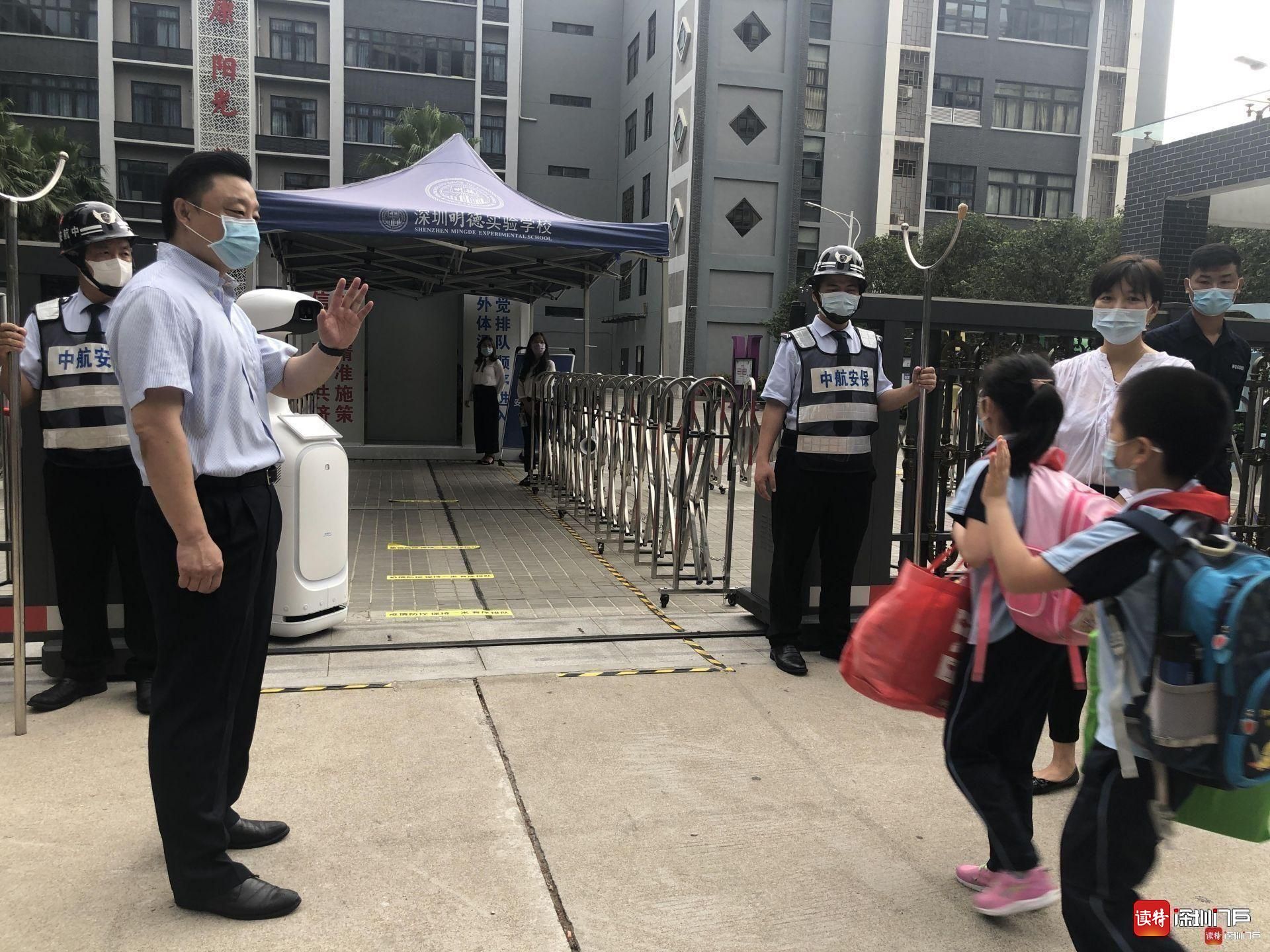 “同學(xué)們好!”“歡迎回來(lái)!”從7點(diǎn)起,明德實(shí)驗(yàn)學(xué)校校長(zhǎng)魯江與工作人員就在香蜜校區(qū)校門(mén)口迎候?qū)W生們,提醒孩子們戴好口罩,也與家長(zhǎng)們交流返校事宜。校門(mén)口的一臺(tái)超氧水消殺機(jī)器人也在積極投入工作,工作人員在后臺(tái)控制面板可以監(jiān)測(cè)到入校人員的體溫情況。