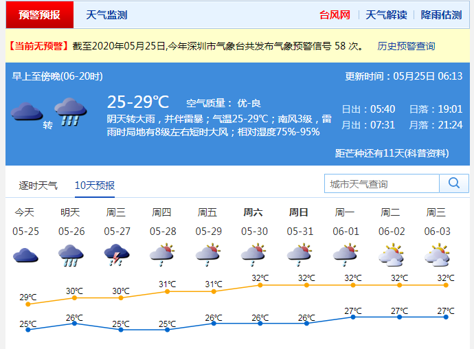 見圳客戶端·深圳新聞網(wǎng)2020年5月25日訊 連續(xù)陰雨雷暴,上周末的天氣趨于平靜,但是,新一波“龍舟水”馬上到貨!據(jù)深圳氣象臺消息,25-26日深圳有大雨到暴雨,并伴有雷暴和8級左右短時大風(fēng),降雨主要出現(xiàn)在25日中午至26日上午,26日午后降雨減弱;27-30日仍有陣雨或雷陣雨。