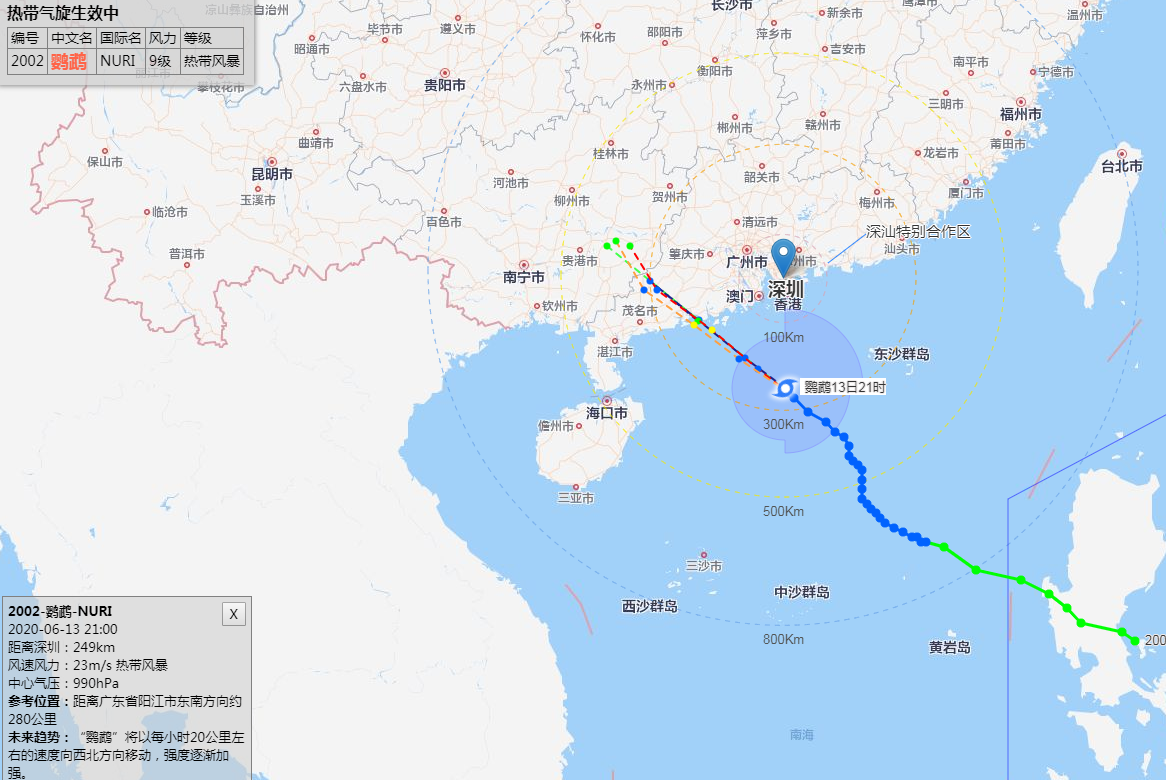 06月14日12時(shí),2002號(hào)臺(tái)風(fēng)“鸚鵡”(熱帶風(fēng)暴級(jí))的中心位于陽(yáng)江市陽(yáng)西縣,中心附近最大風(fēng)力8級(jí),向西北方向移動(dòng),強(qiáng)度逐漸減弱,下午將進(jìn)入廣西。截止目前深圳(含深汕)出現(xiàn)中雨局部大雨和6-9級(jí)陣風(fēng)。今天午后有間歇性(雷)陣雨,降雨時(shí)伴有6-7級(jí)陣風(fēng)。