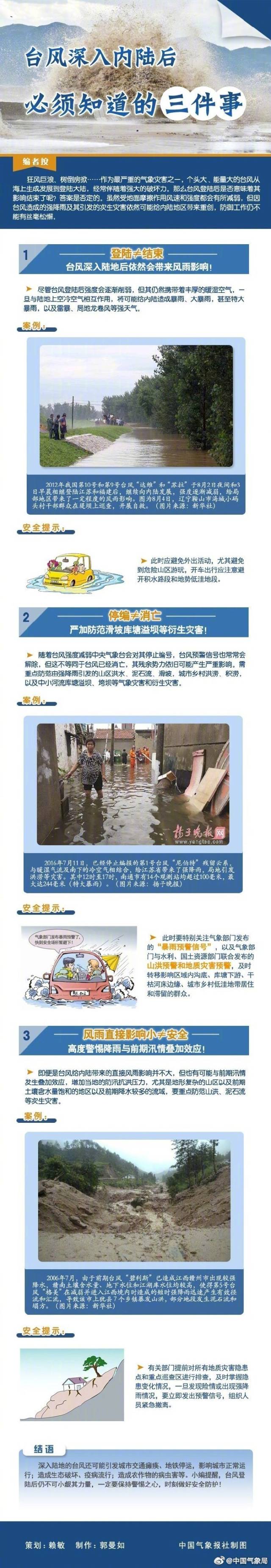 3、風(fēng)雨直接影響小不等于安全。即便臺(tái)風(fēng)給內(nèi)陸帶來(lái)的直接風(fēng)雨影響不大,但可能與前期汛情疊加,產(chǎn)生泥石流等次生災(zāi)害。