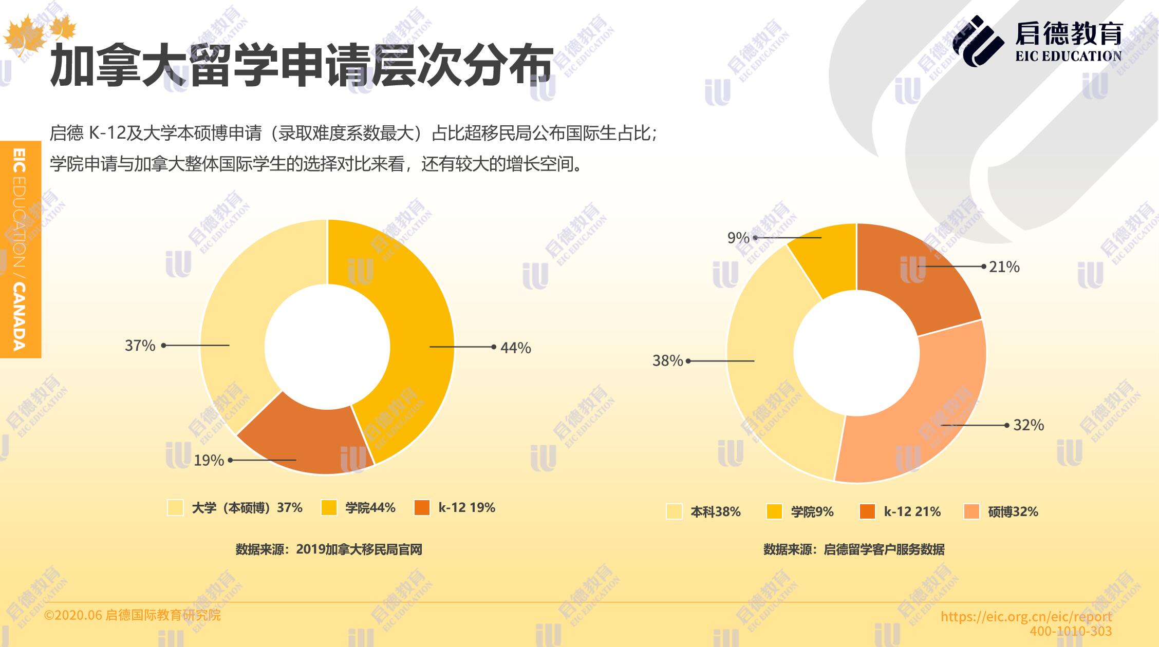 加拿大移民局官網(wǎng)2019年數(shù)據(jù)顯示,加拿大國(guó)際學(xué)生中 K-12階段申請(qǐng)占比為19%,大學(xué)(本、碩、博)申請(qǐng)占比37%,學(xué)院申請(qǐng)占比44%。啟德留學(xué)客戶服務(wù)數(shù)據(jù)顯示,2019年通過(guò)啟德申請(qǐng)加拿大留學(xué)的學(xué)生中,申請(qǐng)本科與碩博的學(xué)生占比分別為38%與32%,申請(qǐng)學(xué)院的占比為9 %,申請(qǐng)中學(xué)及其它的占比為21%,與加拿大移民局的官方數(shù)據(jù)對(duì)比來(lái)看,中國(guó)學(xué)生本科留學(xué)加拿大的占比較高,且在學(xué)院類申請(qǐng)中仍有不小的增長(zhǎng)空間。