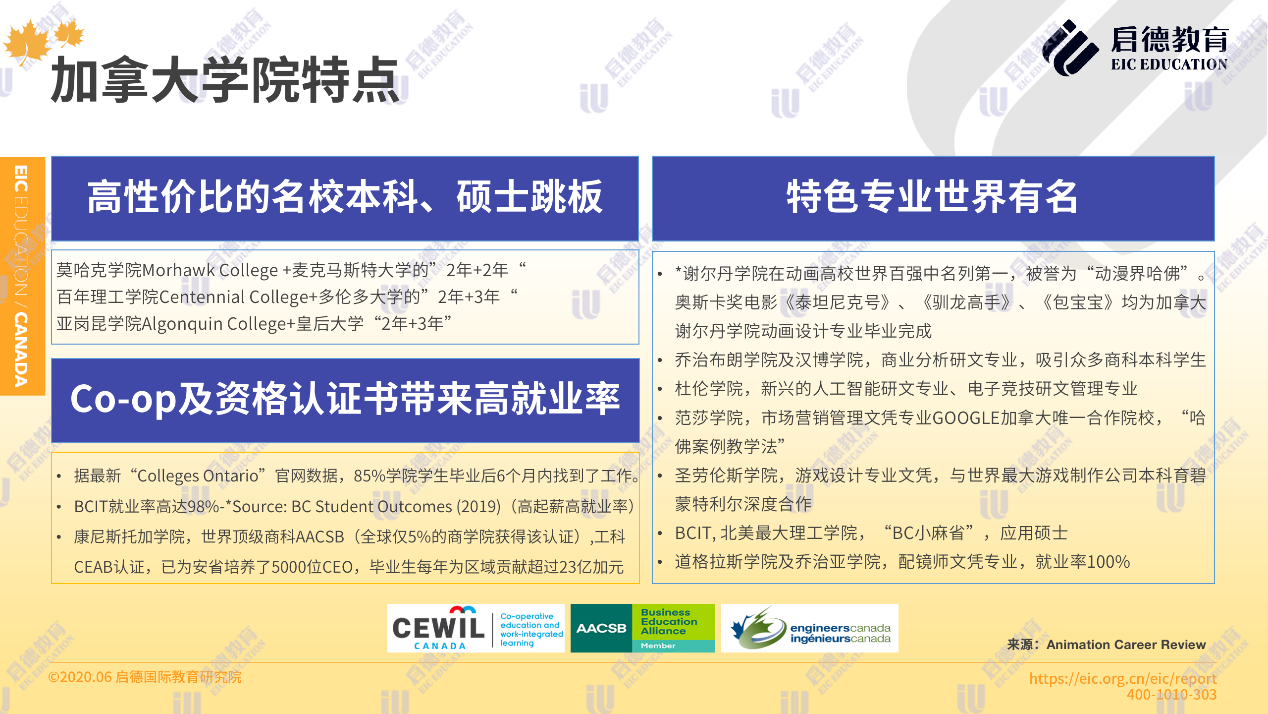 據(jù)最新“ Colleges Ontario”官網(wǎng)數(shù)據(jù),85 %的學(xué)院學(xué)生畢業(yè)后6個(gè)月內(nèi)找到了工作,91%的雇主對(duì)學(xué)生表示非常滿意。如康尼斯托加學(xué)院,擁有世界頂級(jí)商科 AACSB與工科 CEAB認(rèn)證,為安省培養(yǎng)了5000位 CEO,畢業(yè)生每年為區(qū)域貢獻(xiàn)超過(guò)23億加元。而奧斯卡獎(jiǎng)電影《泰坦尼克號(hào)》、《馴龍高手》、《包寶寶》均為加拿大謝爾丹學(xué)院動(dòng)畫(huà)設(shè)計(jì)專業(yè)畢業(yè)完成。北阿伯塔學(xué)院的納米技術(shù)專業(yè),杜倫學(xué)院的人工智能專業(yè),道格拉斯學(xué)院的配鏡師專業(yè),范莎學(xué)院的飛機(jī)維修專業(yè)也是世界有名的特色專業(yè)。