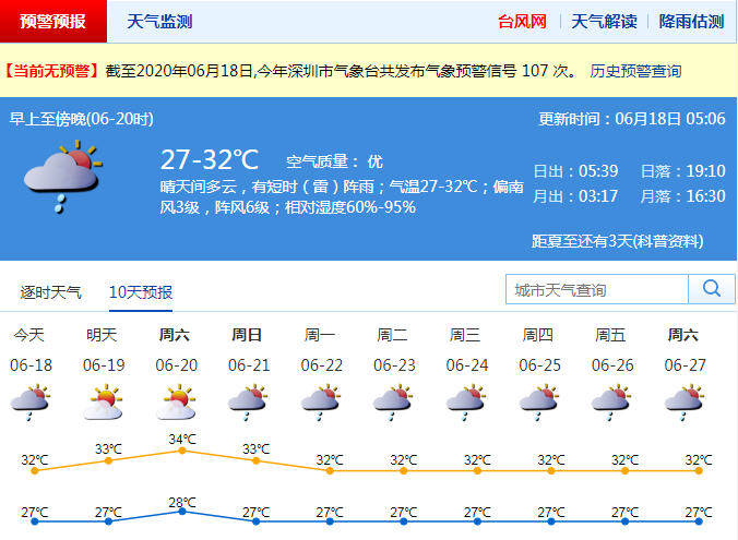 見圳客戶端·深圳新聞網(wǎng)2020年6月18日訊 連日來,鵬城氣溫逐日攀升,部分時間出現(xiàn)分散陣雨。早晨最低氣溫26℃-28℃,白天最高氣溫32℃-33℃。市氣象臺預測,未來3天天氣悶熱,午后易出現(xiàn)局地熱雷雨。