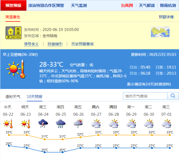 見圳客戶端?深圳新聞網(wǎng)2020年6月22日訊 據(jù)深圳氣象局消息,6月22日,深圳晴天間多云,天氣炎熱,局地有短時(shí)雷雨;氣溫28-33℃,中北部地區(qū)最高氣溫35℃;南風(fēng)3級(jí),陣風(fēng)5-6級(jí);相對(duì)濕度60%-90%。