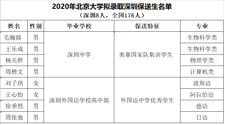 2020年北京大學擬錄取深圳保送生名單